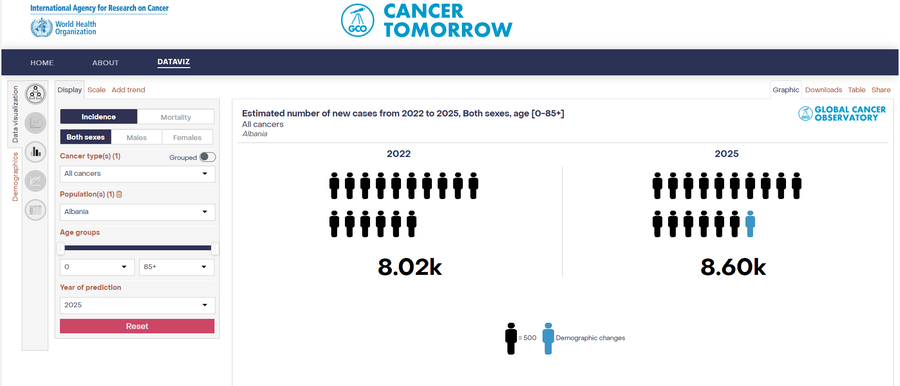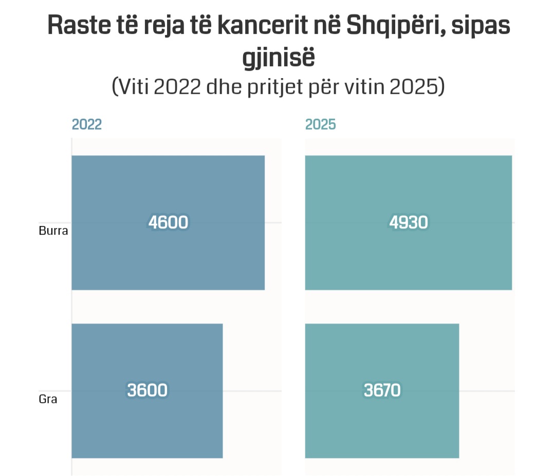 Specifikisht, në vitin 2022 rreth 4,600 raste të identifikuara i përkisnin burrave dhe 3,400 grave, ndërkohë që në vitin 2025 pritet që të ketë një rritje me rreth 7% të rasteve të reja të kancerit për të dyja gjinitë. Në vlerë absolute themi se vitin e ardhshëm pritet të jenë 3,670 gra dhe 4,930 burra të prekur nga kanceri.